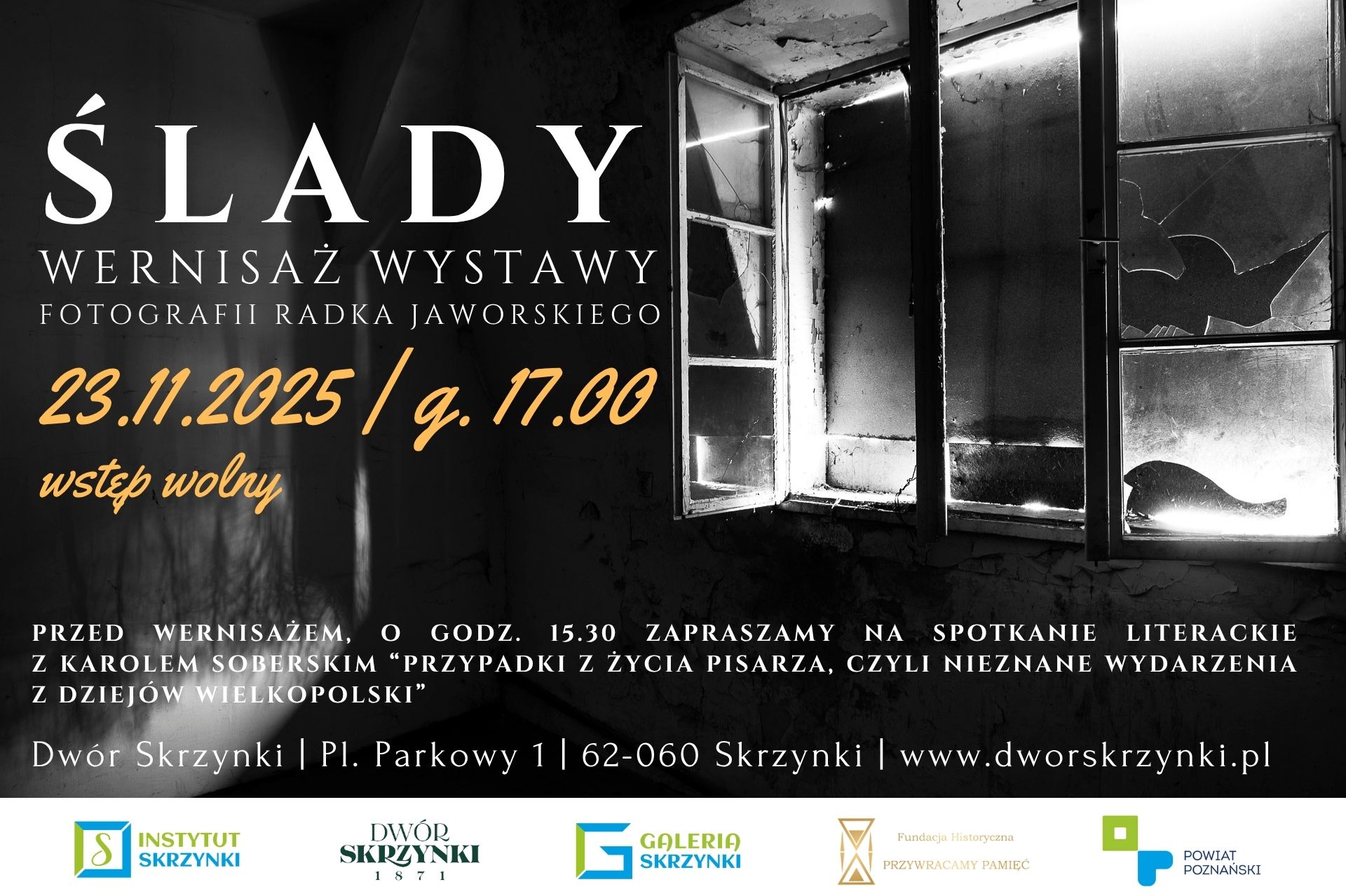 Tego samego dnia o godz. 17.00 odbędzie się wernisaż fotografii Radka Jaworskiego pt. „Ślady”. Autor współpracuje z Fundacją Historyczną „Przywracamy Pamięć,” a 20 niesamowitych fotografii jest efektem wizyty artysty w zrujnowanym pałacu w Jaszczurowej. Wystawa to 20 czarno-białych fotografii, które zostały zrobione we wnętrzach pałacu w Jaszczurowej. Pusta przestrzeń stała się inspiracją dla wizualnego, poetyckiego eseju o opuszczonej przestrzeni, rzeźbionej przez czas.