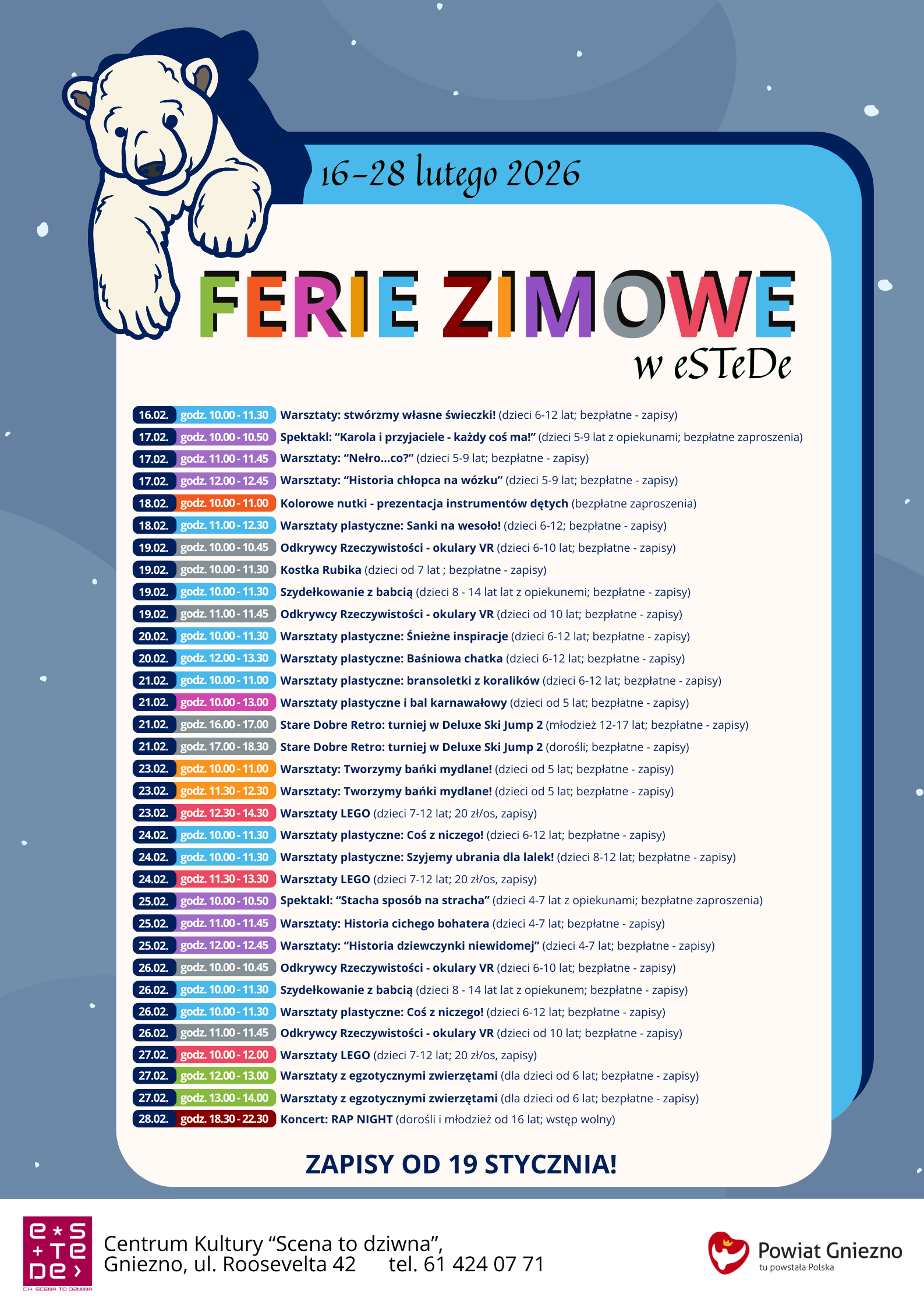 Szczegółowy harmonogram wydarzeń znajduje się na stronie internetowej scenatodziwna.eu - zapisy na warsztaty tradycyjnie odbędą się poprzez biuro CK eSTeDe stacjonarnie oraz telefonicznie (614 240 771).