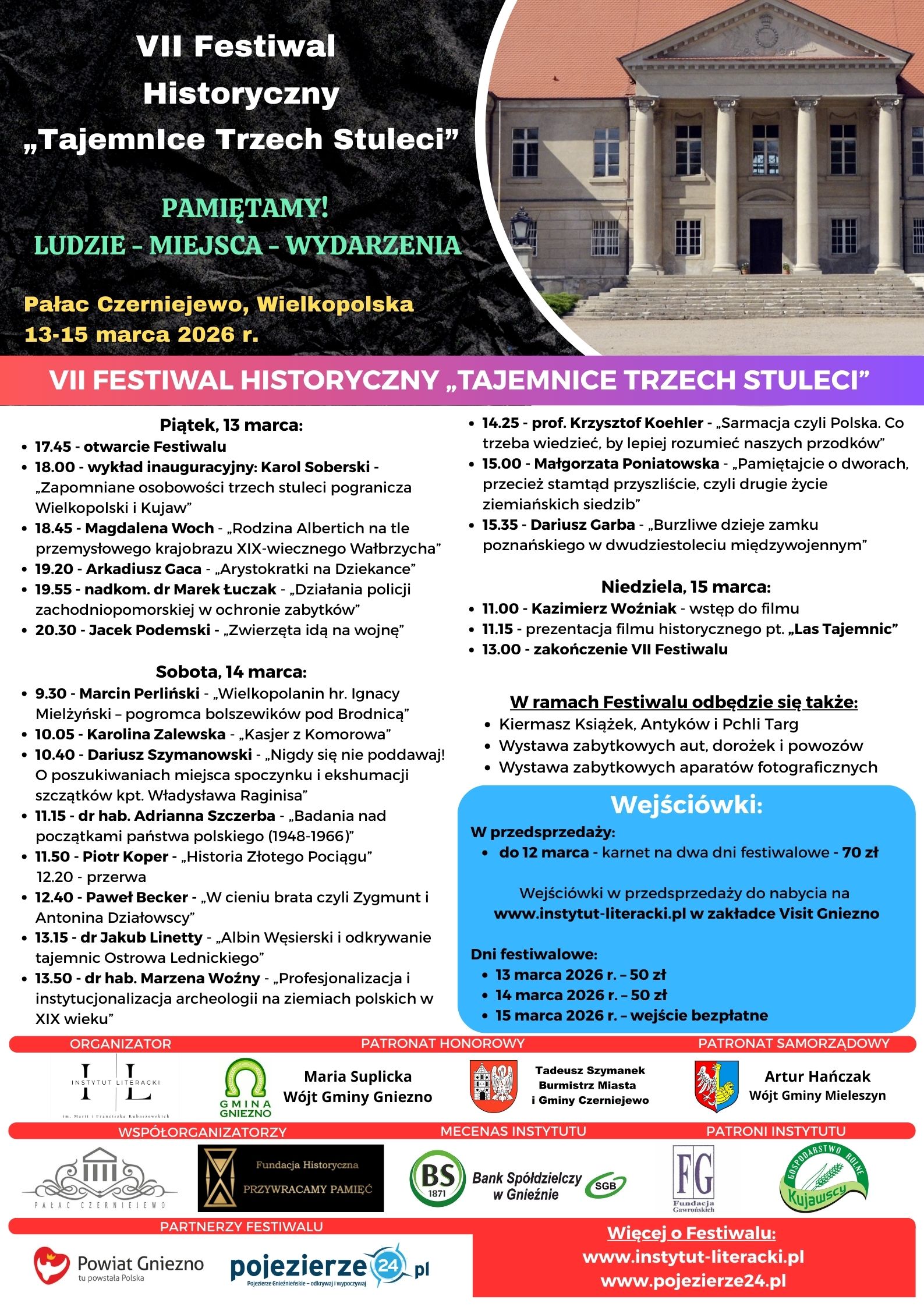 Już za kilka dni w pałacu w Czerniejewie - od 13 do 15 marca - odbędzie się VII Festiwal Historyczny „Tajemnice Trzech Stuleci”. Tegorocznej edycji tego wydarzenia - jednego z najciekawszych w Polsce - towarzyszy hasło „Pamiętamy! Miejsca - ludzie - wydarzenia”. W gronie 17 prelegentów znalazły się wybitne osobowości z całej Polski. Od dzisiaj aż do inauguracji Festiwalu, będziemy zachęcać naszych Czytelników do udziału w kilku wybranych prelekcjach, ale oczywiście zapraszamy na wszystkie wykłady. Dzisiaj o prelekcji nadkom. dr Marka Łuczaka z Komendy Wojewódzkiej Policji w Szczecinie. Jego wykład - w piątek, 13 marca o godz. 19.55 - jest zatytułowany „Działania policji zachodniopomorskiej w ochronie zabytków”.