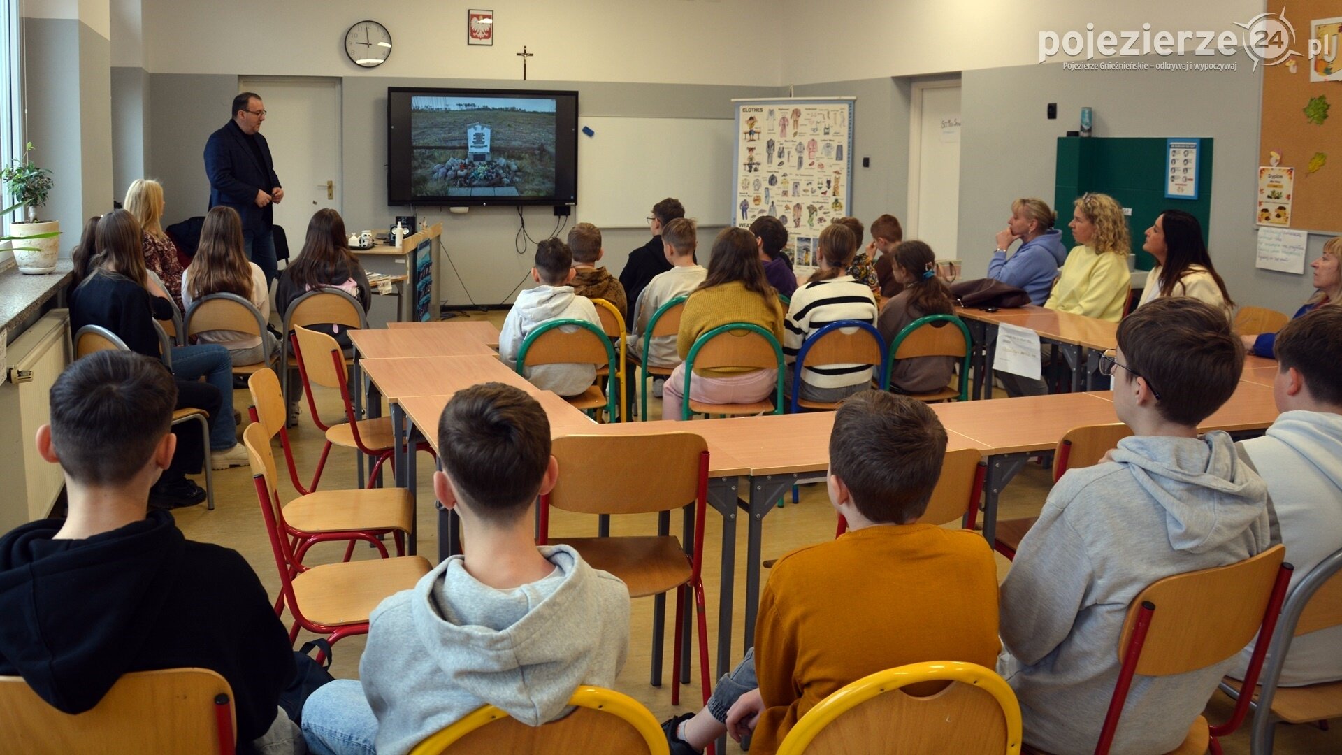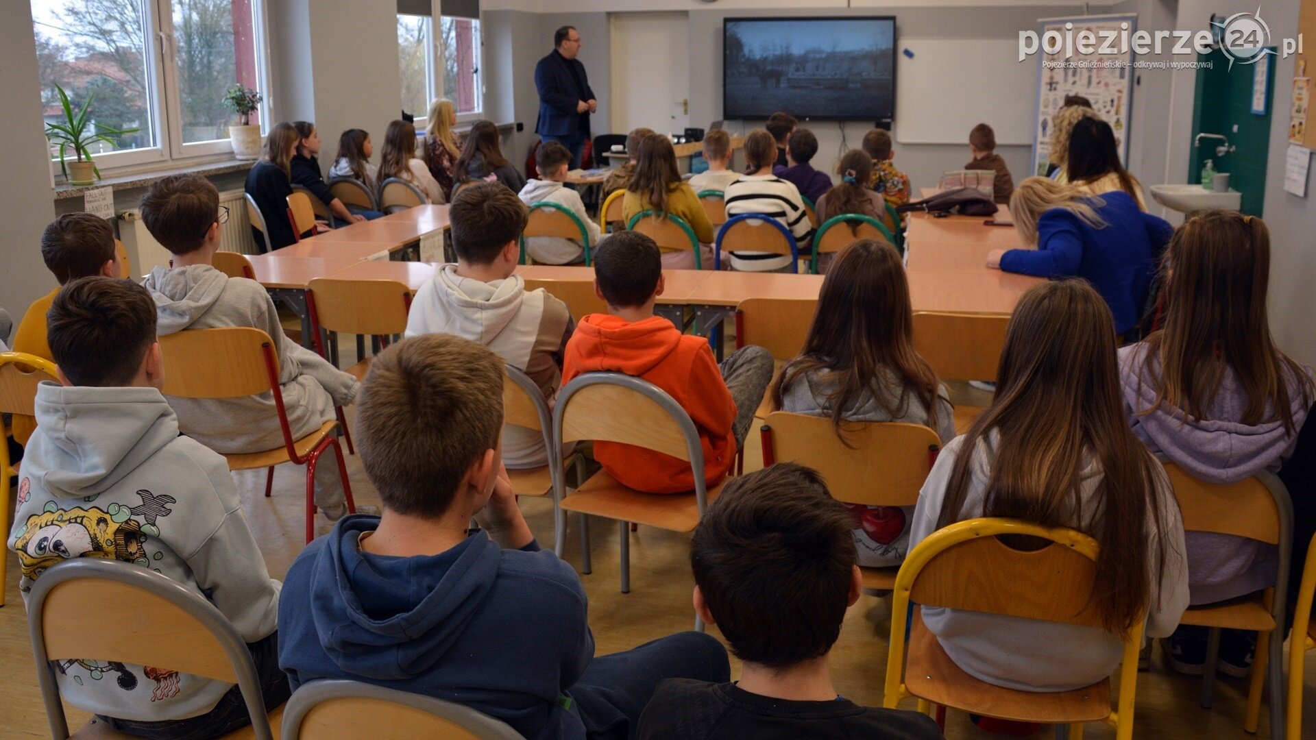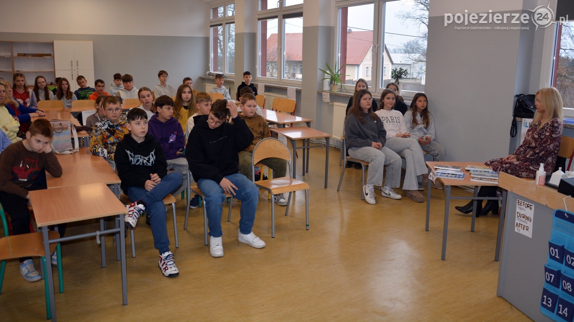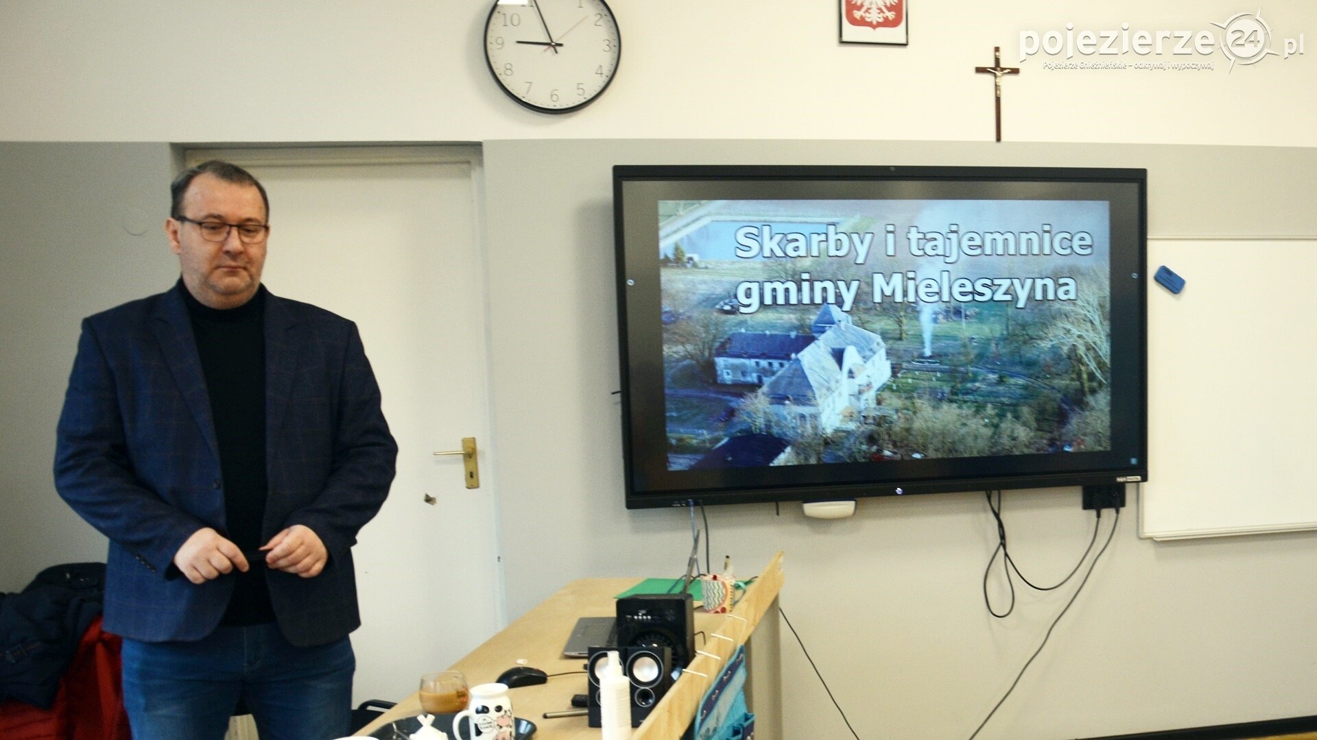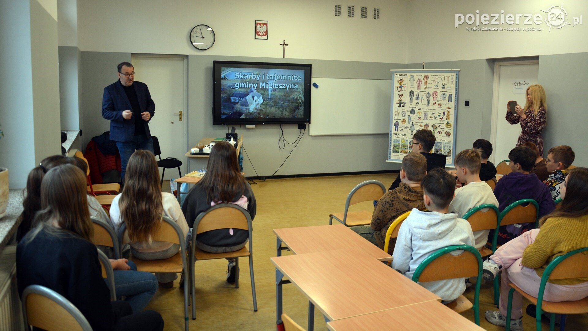 Następnie przez 45 minut opowiadałem uczniom o walorach historycznych i turystycznych gminy Mieleszyn, o skarbach i tajemnicach zarówno tych związanych z okresem międzywojennym, jak i II wojną światową. Mówiłem o zagadkach pałaców w Mielnie, Dziadkowie, Popowie Podleśnym, Przysiece, Popowie Ignacewie, a także o tajemnicach Łopienna, Sokolnik, Świątnik Małych, Jezioro Utrata, Lasów Nowaszyckich, czy też o sekretach miejsc, których już nie ma, jak choćby Huby Mieleńskie.
