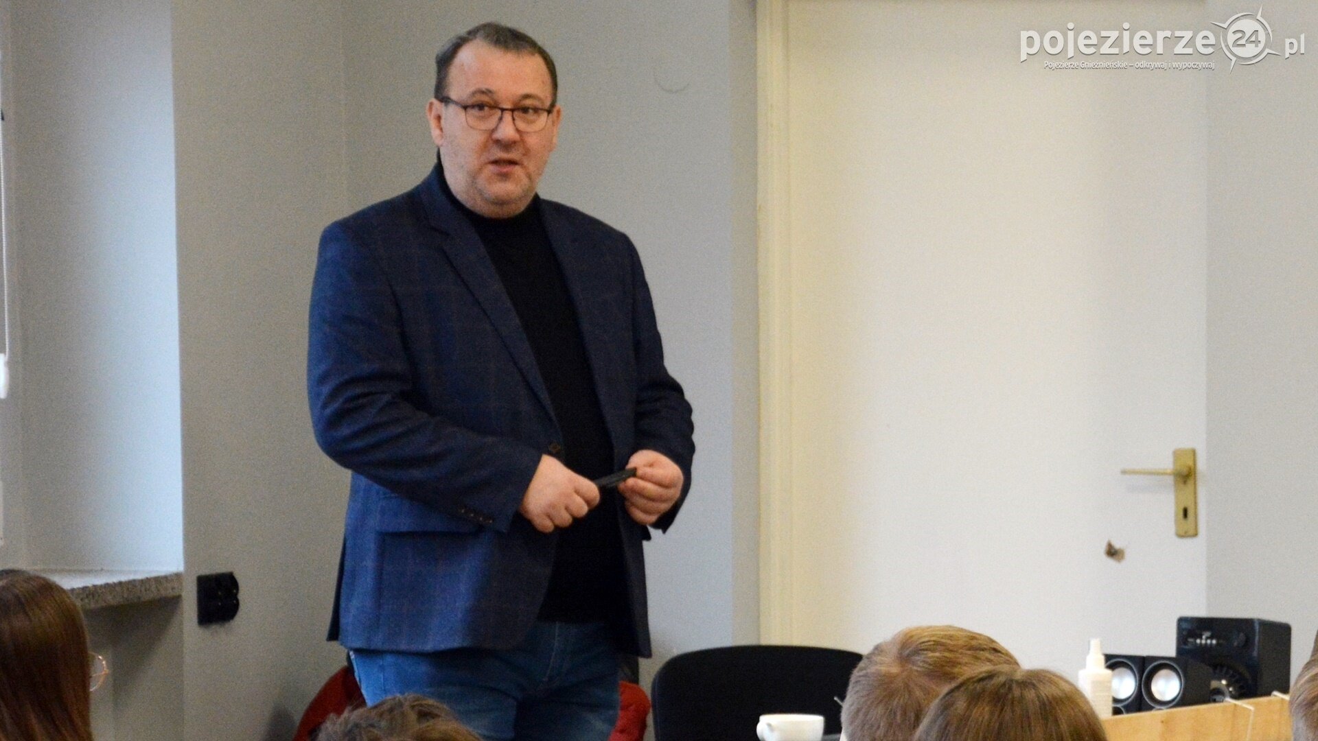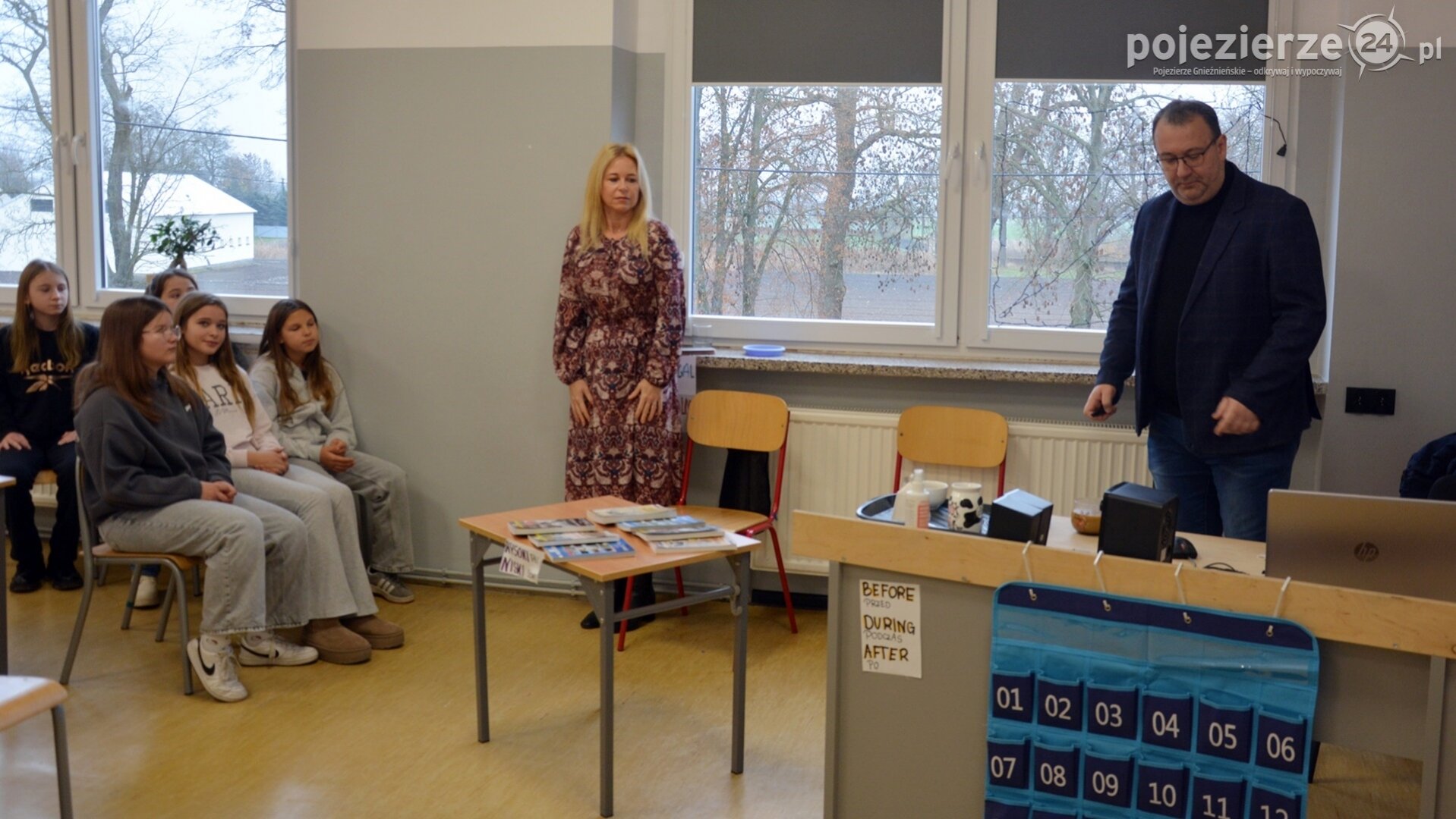 Zanim ponad 40-osobowej grupie uczniów z klas V – VII, opowiedziałem o „Skarbach i tajemnicach gminy Mieleszyn”, wszystkich powitał Maciej Krysiak, dyrektor szkoły i Olga Hajkowska, dyrektor Gminnej Biblioteki Publicznej w Mieleszynie.