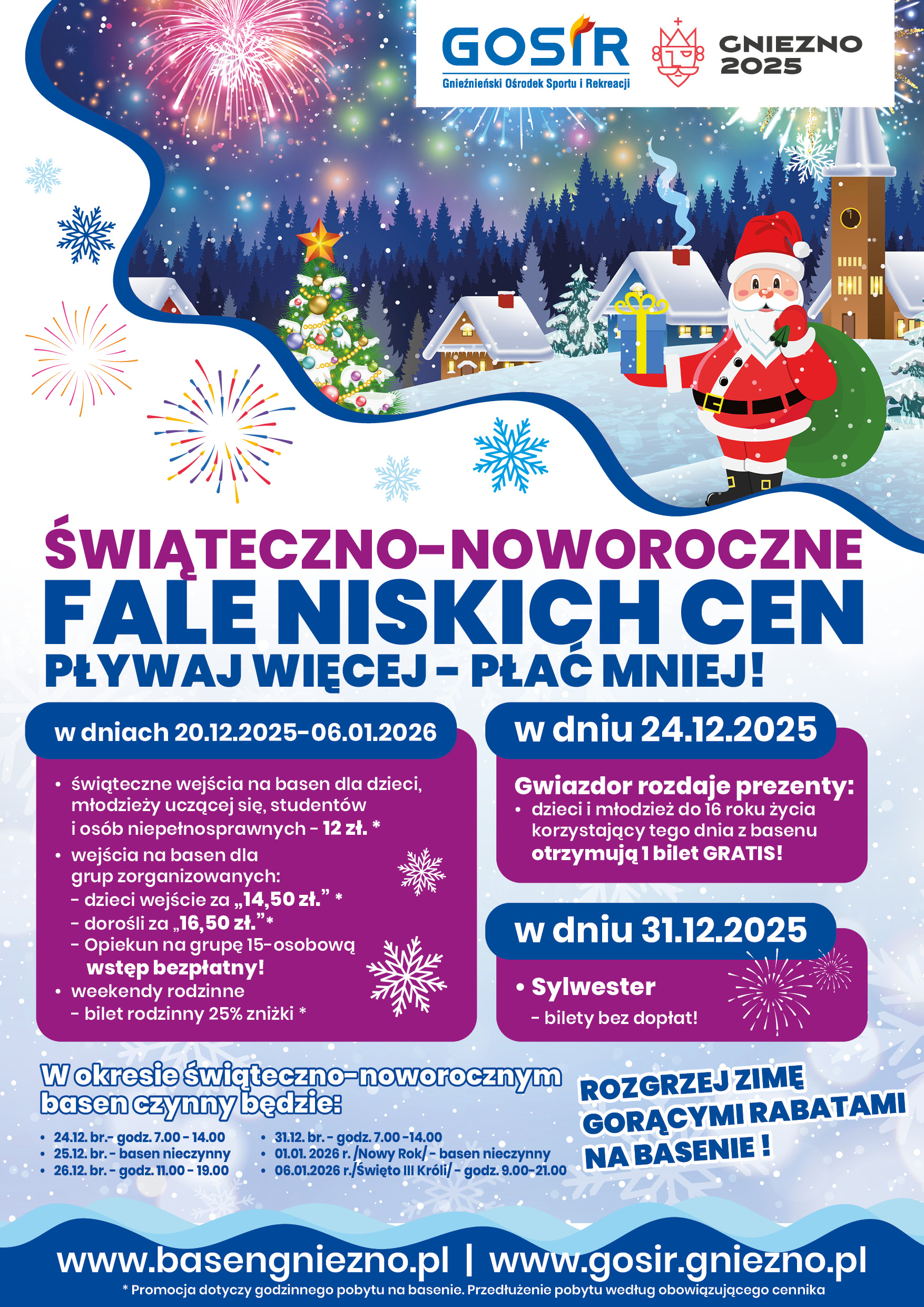 Zanurz się w magiczny klimat świąt i rozpocznij Nowy Rok pełen energii! Gnieźnieński Ośrodek Sportu i Rekreacji zaprasza do skorzystania z wyjątkowych rabatów, które sprawią, że każda wizyta na basenie będzie jeszcze przyjemniejsza.