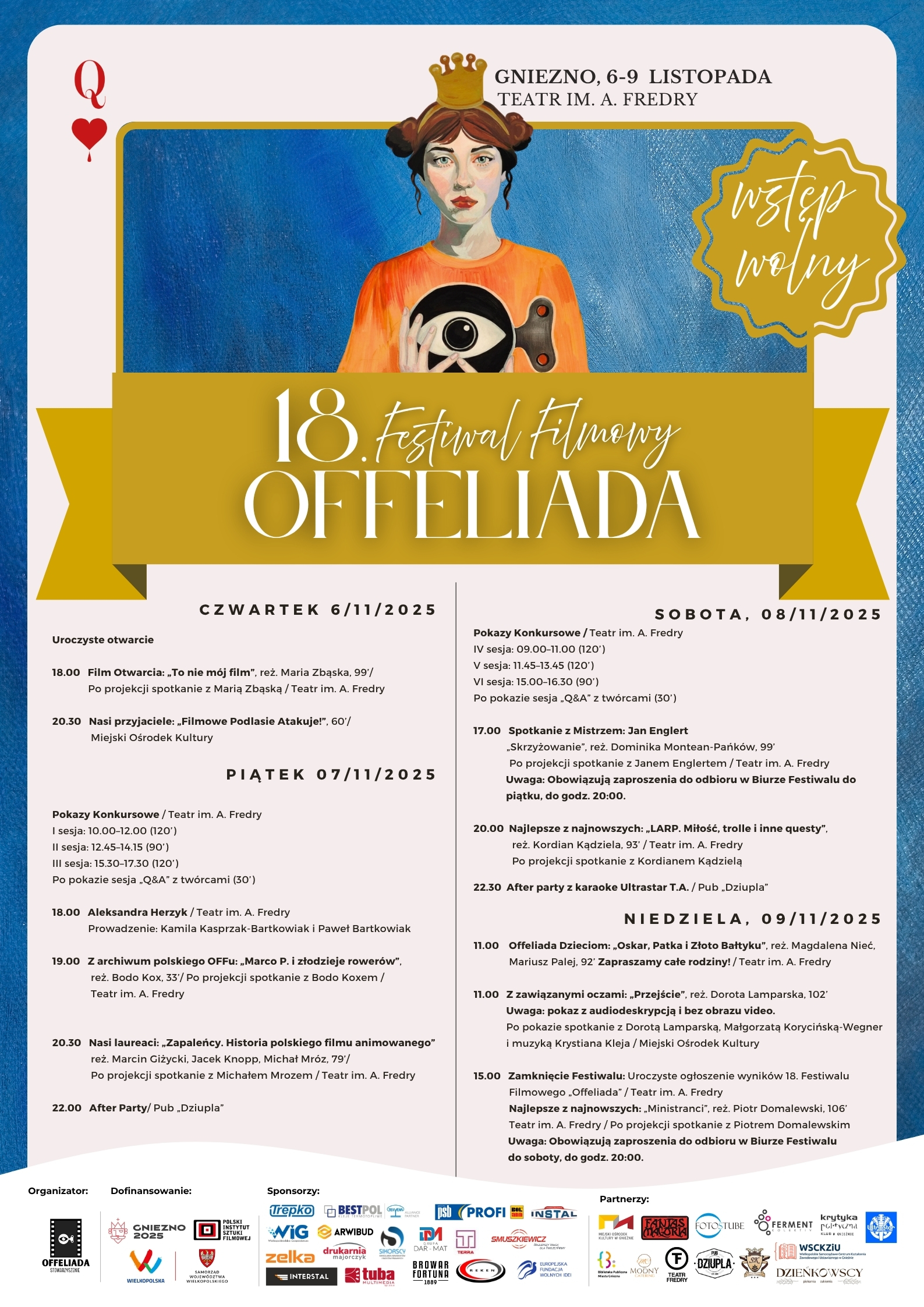 37 filmów festiwalowych, dziewięć pokazów specjalnych i spotkań oraz jedno karaoke - to wszystko czeka na widzów 18. Festiwalu Filmowego Offeliada w Gnieźnie, którzy między 6 a 9 listopada przybędą do Teatru im. A. Fredry i Miejskiego Ośrodka Kultury w Gnieźnie!