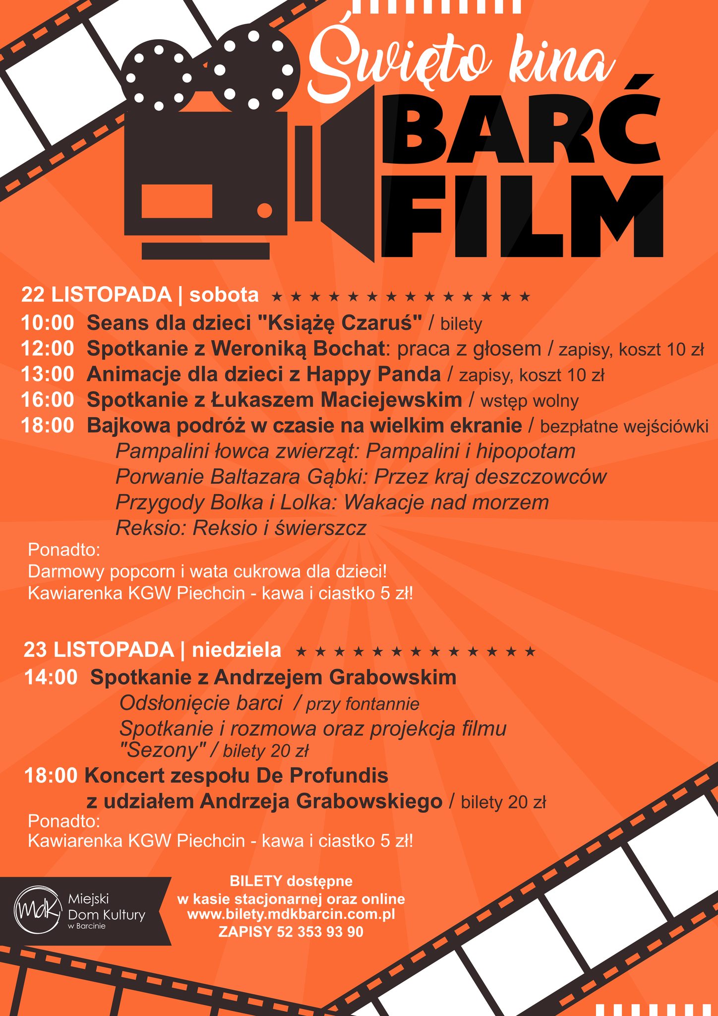 Ale po kolei. Impreza rozpocznie się w sobotę, 22 listopada, o godz. 10.00 od seansu dla dzieci "Książę Czaruś". Godzinę później zaplanowano spotkanie z Weroniką Bochat, która przeprowadzi warsztaty z pracy z głosem. Godz. 13.00 to animacje dla dzieci z Happy Panda. Po południu o godz. 16.00 zaplanowano spotkanie z Łukaszem Maciejewskim, krytykiem filmowym, który z barcińskim wydarzeniem związany jest od początku istnienia. Od godz. 18.00 rozpoczną się projekcje seansów nawiązujących do bajkowych podróży w czasie m.in. "Pampalini łowca zwierząt: Pampalini i hipopotam" czy "Przygody Bolka i Lolka: Wakacje nad morzem".