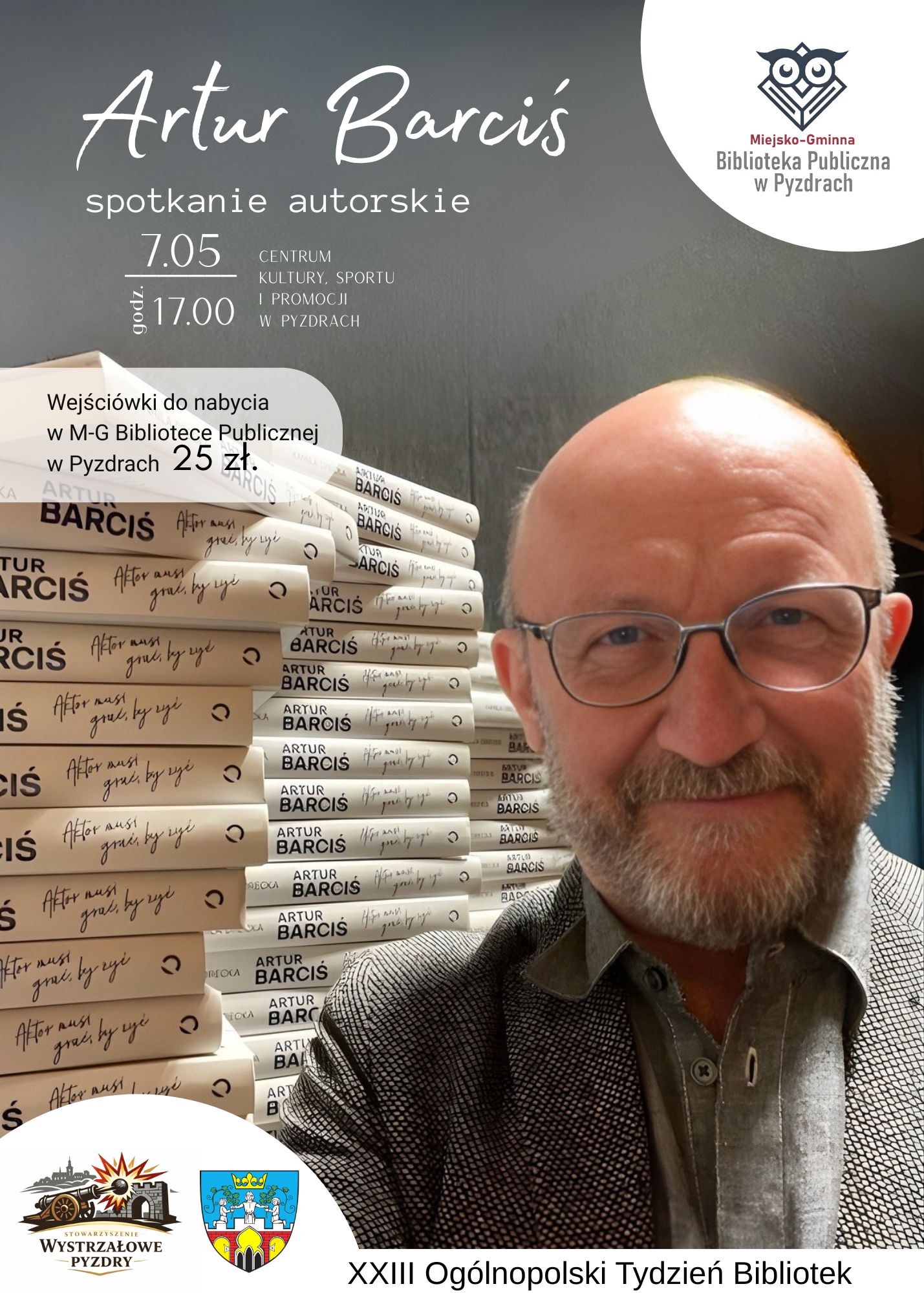 Miejsko-Gminna Biblioteka Publiczna w Pyzdrach zaprasza na spotkanie z jednym z najbardziej znanych polskich aktorów - Arturem Barcisiem! Spotkanie odbędzie się - w ramach Ogólnopolskiego Tygodnia Bibliotek - w czwartek, 7 maja o godz. 17.00 w Centrum Kultury, Sportu i Promocji w Pyzdrach. Wejściówki w cenie 25 zł do nabycia w bibliotece.