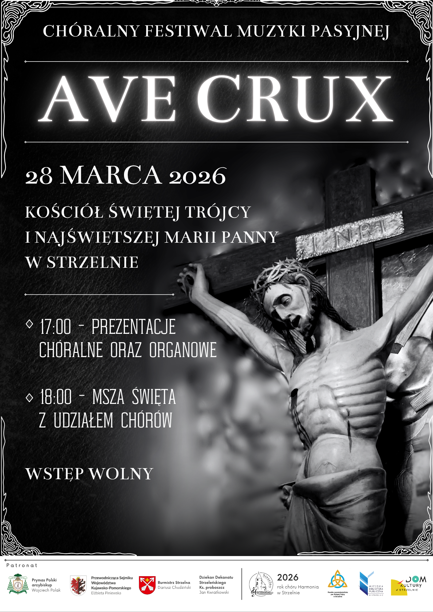 Dom Kultury w Strzelnie zaprasza na Chóralny Festiwal Muzyki Pasyjnej „Ave Crux”, który odbędzie się 28 marca 2026 roku w Kościele Świętej Trójcy i Najświętszej Marii Panny w Strzelnie. Wydarzenie będzie okazją do wysłuchania muzyki pasyjnej w wykonaniu chórów oraz organistów.