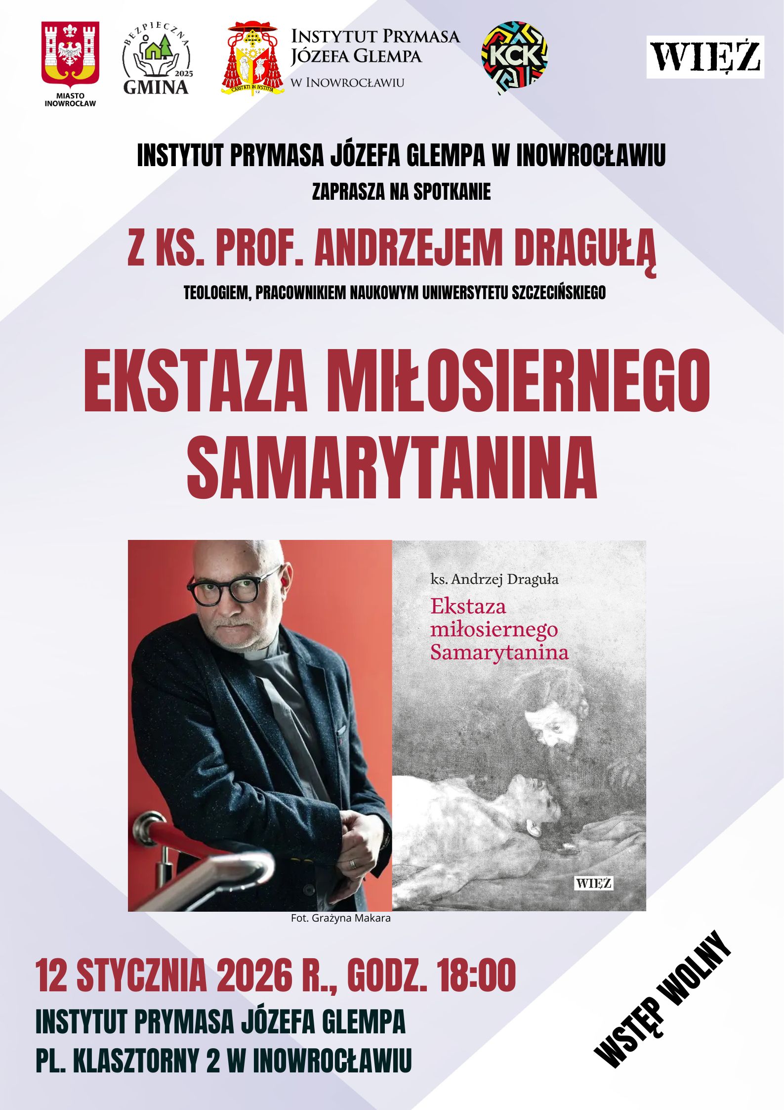 Instytut Prymasa Józefa Glempa zaprasza na spotkanie autorskie z ks. prof. Andrzejem Dragułą, teologiem, pracownikiem naukowym Uniwersytetu Szczecińskiego wokół książki „Ekstaza miłosiernego Samarytanina”. Wydarzenie odbędzie się 12 stycznia 2026 r. o godz. 18:00 w Instytucie Prymasa Józefa Glempa - pl. Klasztorny 2 w Inowrocławiu. Wstęp wolny!
