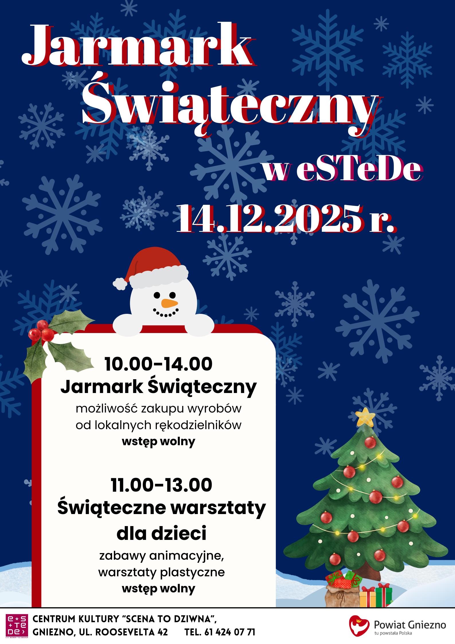 Okolicznościowe jarmarki to mała tradycja w CK eSTeDe. Po jesiennej edycji zapraszamy wszystkich mieszkańców powiatu gnieźnieńskiego na zimową, świąteczną odsłonę kiermaszu. Dla miłośników rękodzieła to nie lada gratka – podczas Jarmarku będzie okazja do zakupu niepowtarzalnych, ręcznie robionych produktów od lokalnych rzemieślników i artystów.