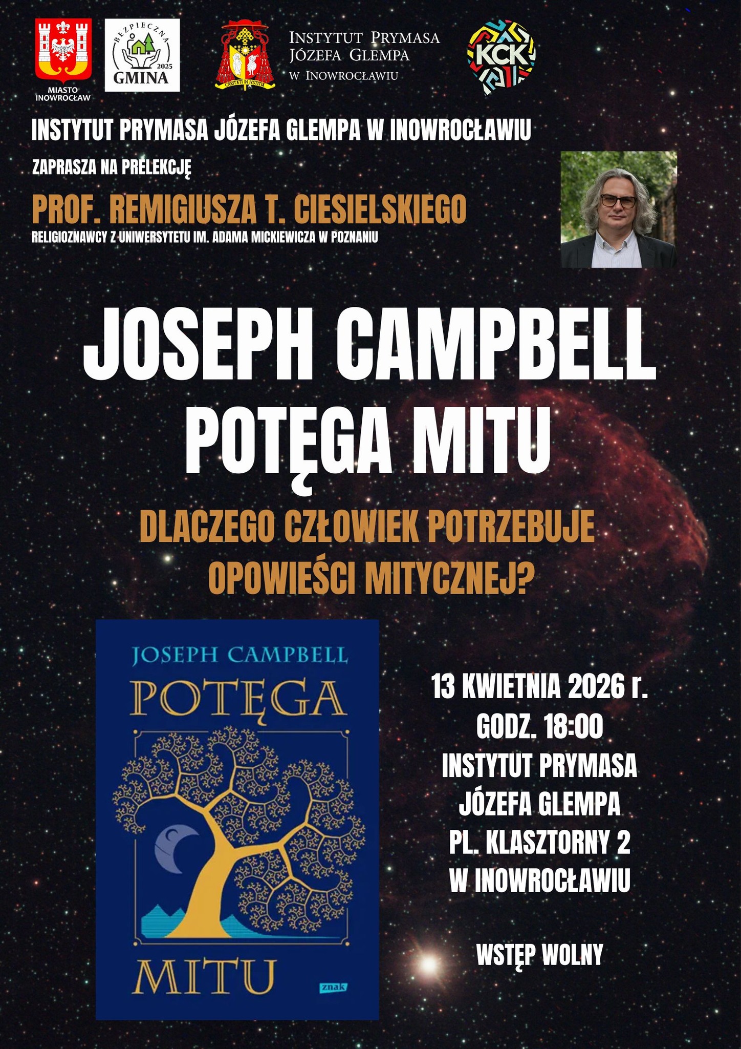 Instytut Prymasa Józefa Glempa zaprasza na prelekcję prof. Remigiusza T. Ciesielskiego, religioznawcy z Uniwersytetu im. Adama Mickiewicza w Poznaniu pt. „Joseph Campbell, Potęga mitu - dlaczego człowiek potrzebuje opowieści mitycznej?” Wydarzenie odbędzie się 13 kwietnia 2026 r. o godz. 18:00 w Instytucie Prymasa J. Glempa - pl. Klasztorny 2 w Inowrocławiu. Wstęp wolny!
