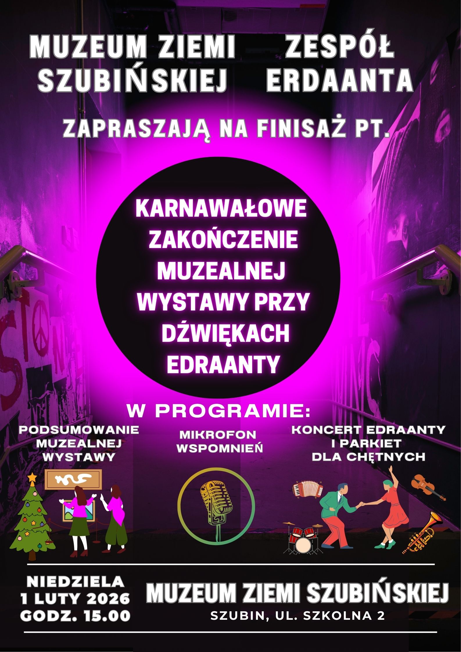 Muzeum Ziemi Szubińskiej zaprasza na Karnawałowe zakończenie muzealnej wystawy przy dźwiękach zespołu EDRAANTA. Spotkanie odbędzie się w niedzielę 1 lutego o godz. 15.00 w Muzeum Ziemi Szubińskiej.