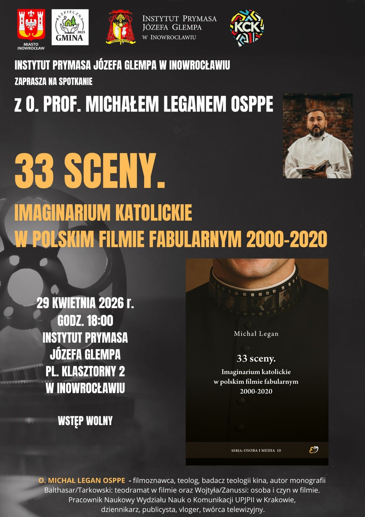 Instytut Prymasa Józefa Glempa w Inowrocławiu serdecznie zaprasza na spotkanie z o. prof. Michałem Leganem OSPPE pt.: „33 sceny. Imaginarium katolickie w polskim filmie fabularnym 2000–2020”. Wydarzenie odbędzie się w środę, 29 kwietnia 2026 r. o godz. 18.00.