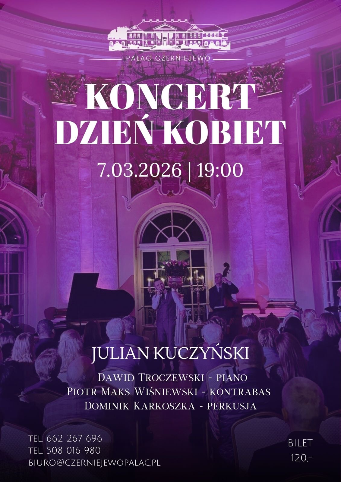 Z kolei 7 marca zapraszamy na wyjątkowy, nastrojowy wieczór muzyczny w zabytkowych wnętrzach Pałacu Czerniejewo. Z okazji Dnia Kobiet czeka na Państwa koncert pełen elegancji, emocji i pięknych dźwięków. Wystąpią dla Państwa: Julian Kuczyński - wokal, Dawid Troczewski – fortepian, Piotr Maks Wiśniewski – kontrabas i Dominik Karkoszka – perkusja.