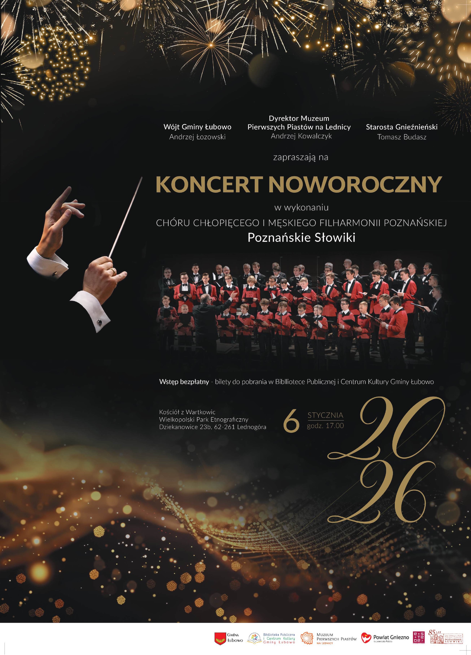 Wójt Gminy Łubowo Andrzej Łozowski, Dyrektor Muzeum Pierwszych Piastów na Lednicy Andrzej Kowalczyk oraz Starosta gnieźnieński Tomasz Budasz zapraszają na wyjątkowy koncert noworoczny. 6 stycznia 2026 r. o godz. 17.00 w Kościele z Wartkowic w Wielkopolskim Parku Etnograficznym w Dziekanowicach wystąpi Chór Chłopięcy i Męski Filharmonii Poznańskiej – ,,Poznańskie Słowiki". Wstęp jest bezpłatny, a bilety można pobrać w Bibliotece Publicznej oraz Centrum Kultury Gminy Łubowo.
