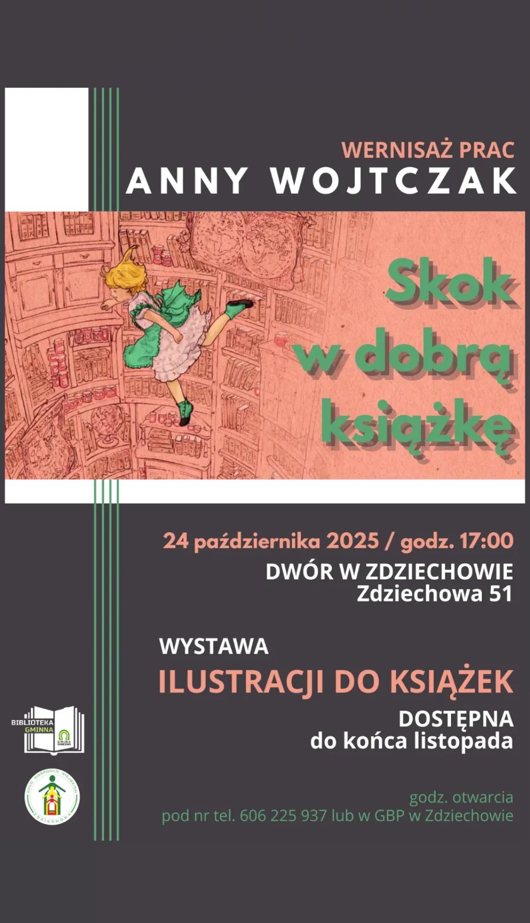 Gminna Biblioteka Publiczna w Zdziechowie serdecznie zaprasza na wernisaż wystawy prac Anny Wojtczak pt. „Skok w dobrą książkę”. Będzie to wyjątkowa ekspozycja ilustracji do książek, autorstwa niezwykle utalentowanej artystki — Anny Wojtczak, znanej również jako artystka pięknych, bajkowych murali zdobiących nasze biblioteki. Wernisaż wystawy odbędzie się w piątek, 24 października o godz. 17.00 we dworze w Zdziechowie.