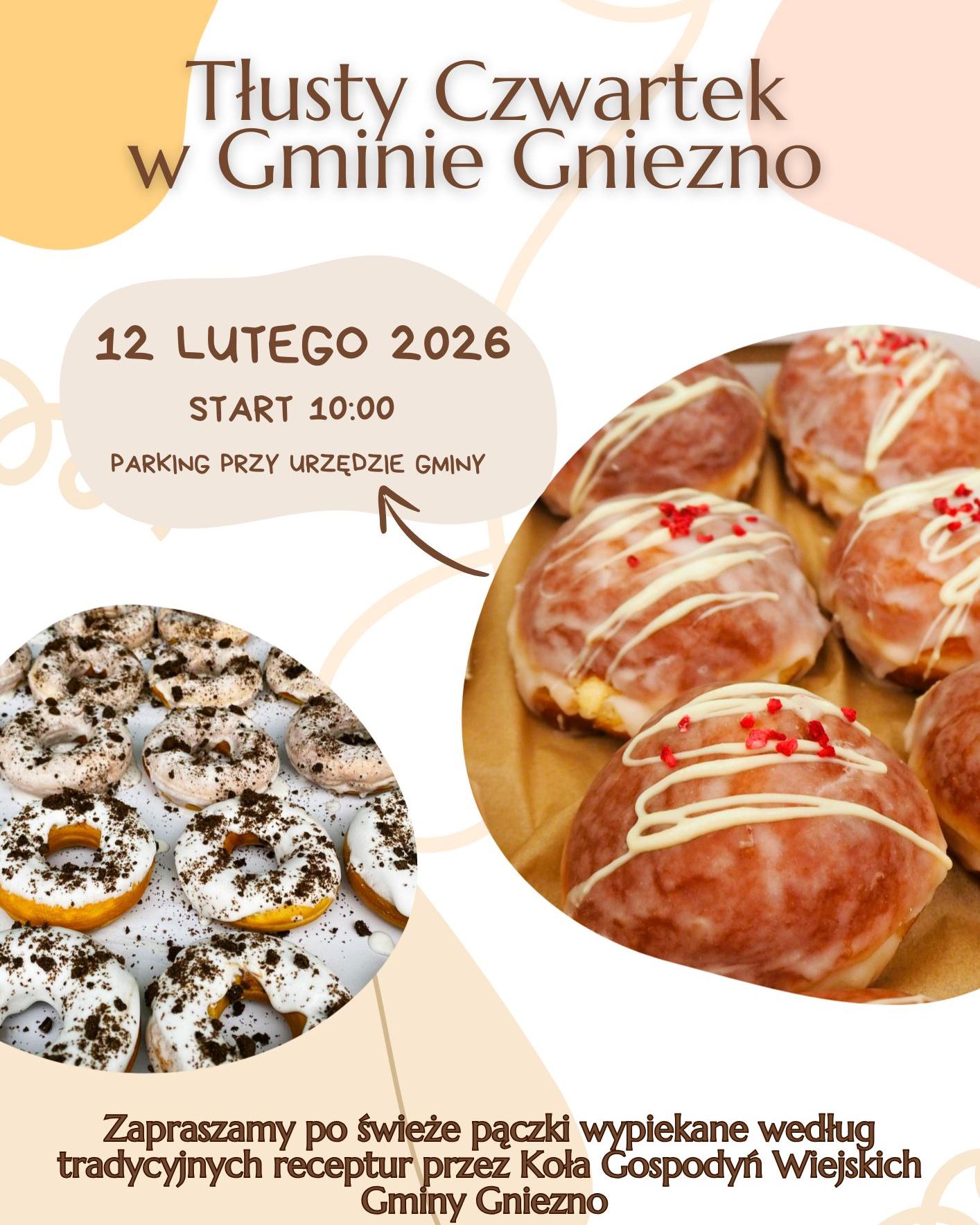 Za kilka dni  Tłusty Czwartek! Z tej okazji, już po raz ósmy, zapraszamy w czwartek, 12 lutego od godz. 10.00 na parking przy Urzędzie Gminy Gniezno, gdzie panie z kół gospodyń wiejskich będą serwować najsmaczniejsze pączki w Wielkopolsce!