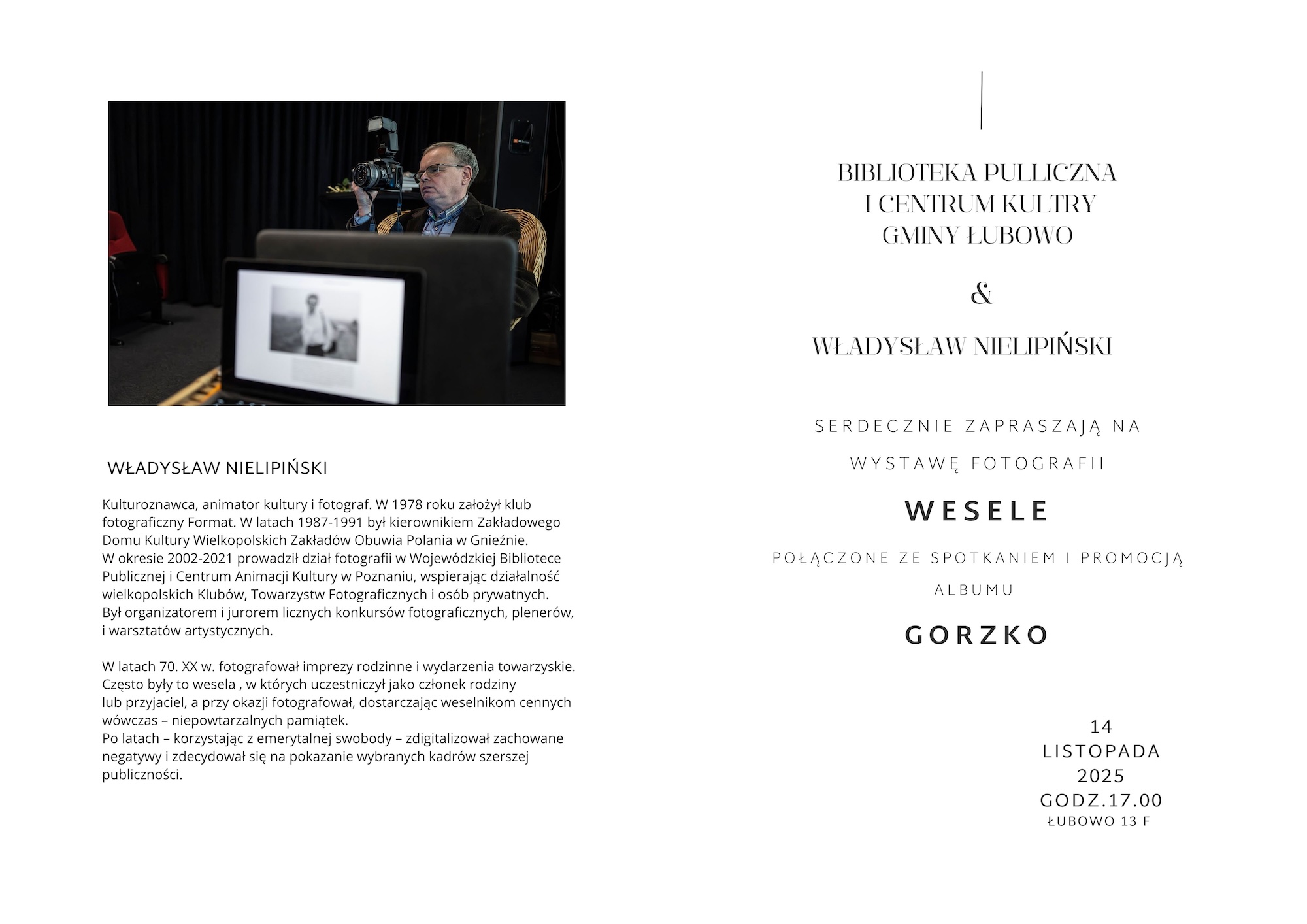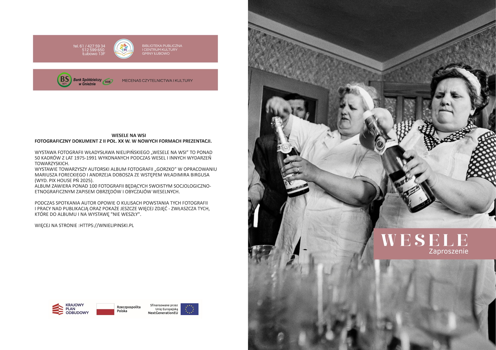 Pamiętacie orkiestry grające przed domem panny młodej, „bramy ze sznurka” i dzieci zatrzymujące samochody dla drobnych? A może kuchnie w świetlicach i wesela do białego rana, kończące się wspólnym śpiewaniem „Kiedy ranne wstają zorze”? Patrząc na czarno-białe fotografie Władysława Nielipińskiego zatytułowane „Wesele”, trudno nie ulec emocjom – wspomnieniom i zadumie. Już 14 listopada o godz. 17.00 w Bibliotece Publicznej i Centrum Kultury Gminy Łubowo będzie można zobaczyć niezwykłe zdjęcia tego artysty i animatora kultury, powstałe w latach 70. XX wieku.