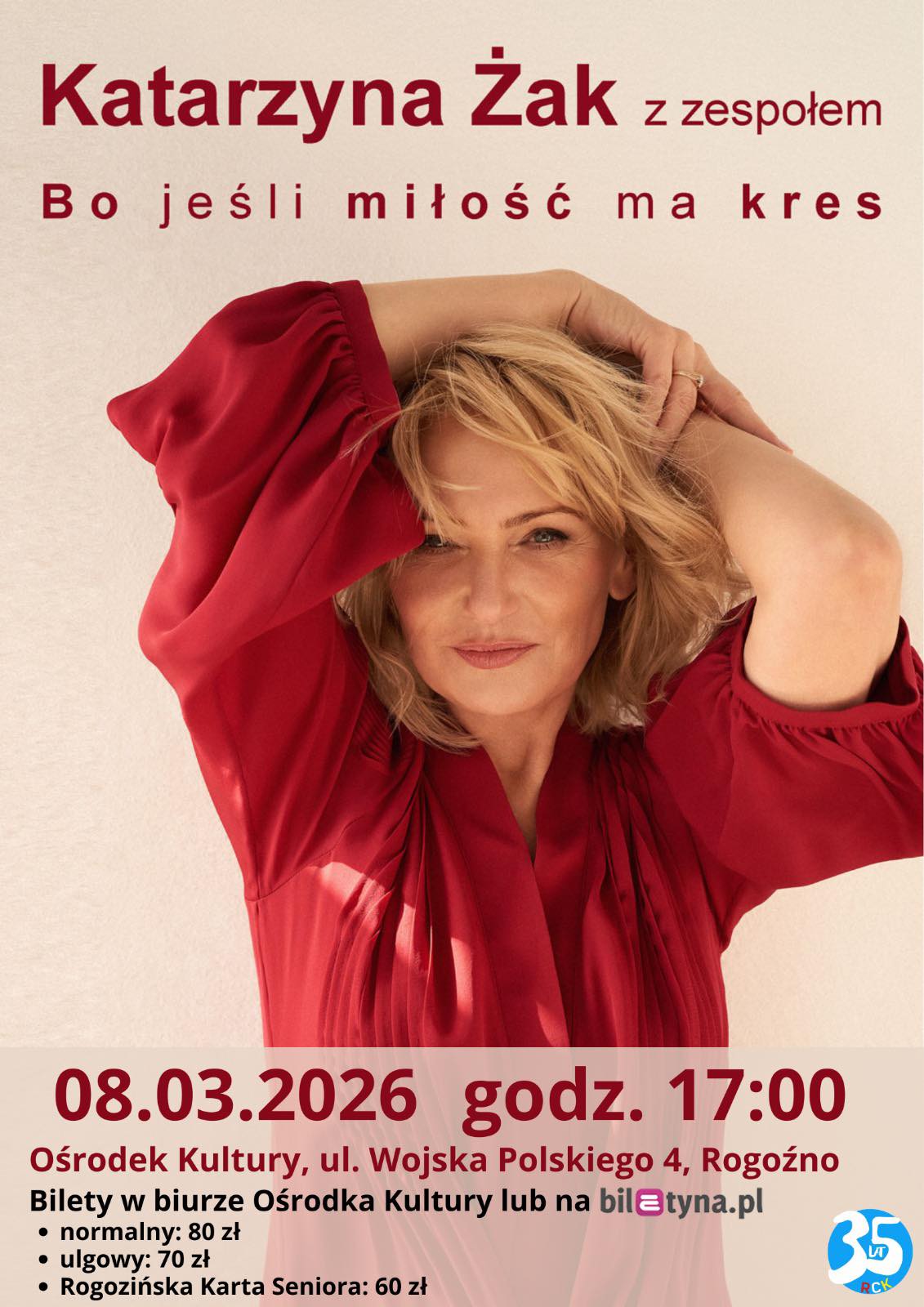Rogozińskie Centrum Kultury zaprasza na niezwykły koncert z okazji Dnia Kobiet! Już w niedzielę, 8 marca o godz. 17.00 w ośrodku kultury wystąpi - z koncertem pt. „Bo jeśli miłość ma kres” - znana i lubiana aktorka Katarzyna Żak z zespołem! Szczegóły na plakacie.