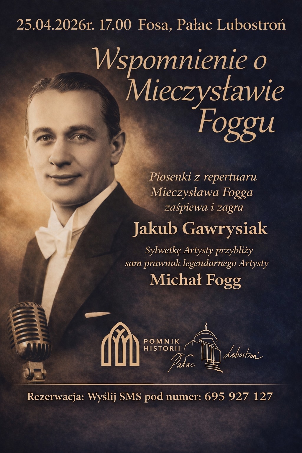 Zapraszamy na wyjątkowy koncert, który przeniesie Państwa w klimat najpiękniejszych polskich melodii i niezapomnianych emocji. Już w sobotę, 25 kwietnia o godz. 17.00 - Fosa, Pałac Lubostroń. Piosenki z repertuaru legendarnego Mieczysława Fogga w interpretacji Jakuba Gawrysiaka, który nie tylko zaśpiewa, ale i zagra dla Państwa na żywo. Sylwetkę Artysty przybliży Michał Fogg – prawnuk Mieczysława Fogga,
