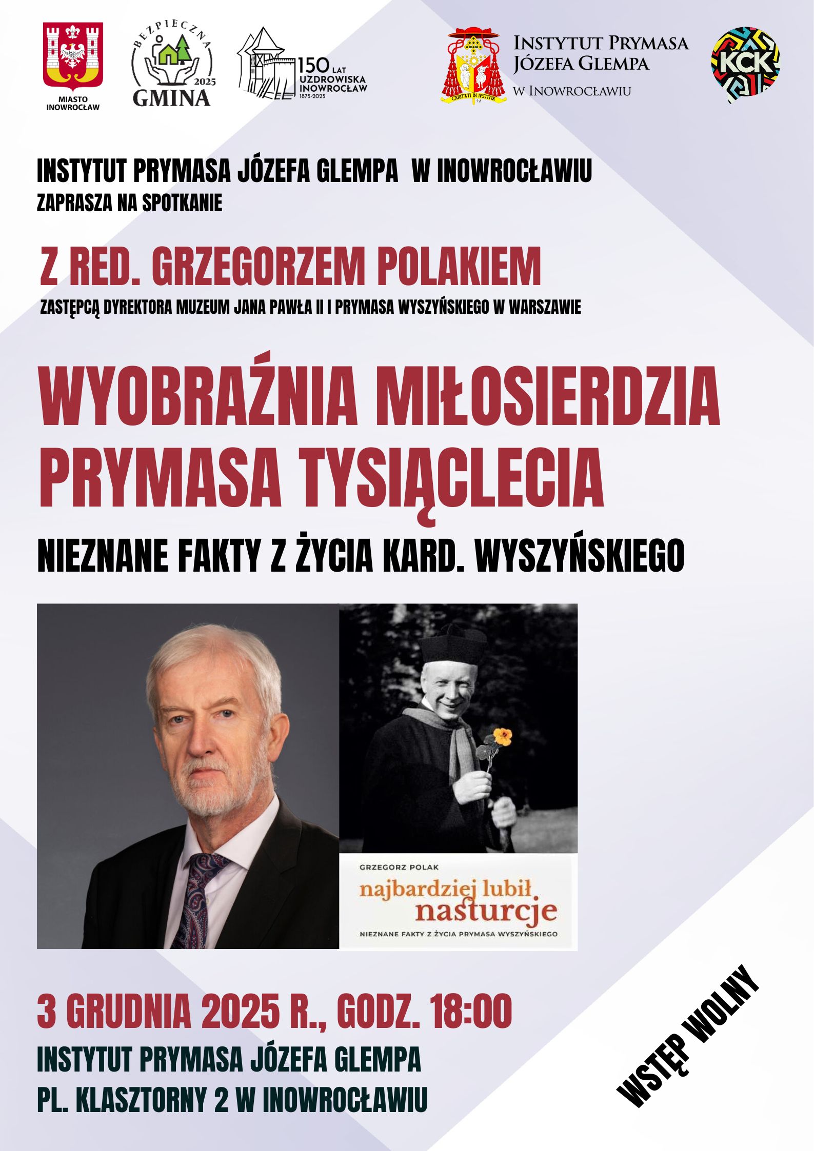 Instytut Prymasa Józefa Glempa zaprasza na spotkanie z red. Grzegorzem Polakiem, zastępcą dyrektora Muzeum Jana Pawła II i Prymasa Wyszyńskiego pt. "Wyobraźnia miłosierdzia Prymasa Tysiąclecia". Wydarzenie odbędzie się 3 grudnia 2025 r. o godz. 18.00 w Instytucie Prymasa Józefa Glempa - pl. Klasztorny 2 w Inowrocławiu. Wstęp wolny.