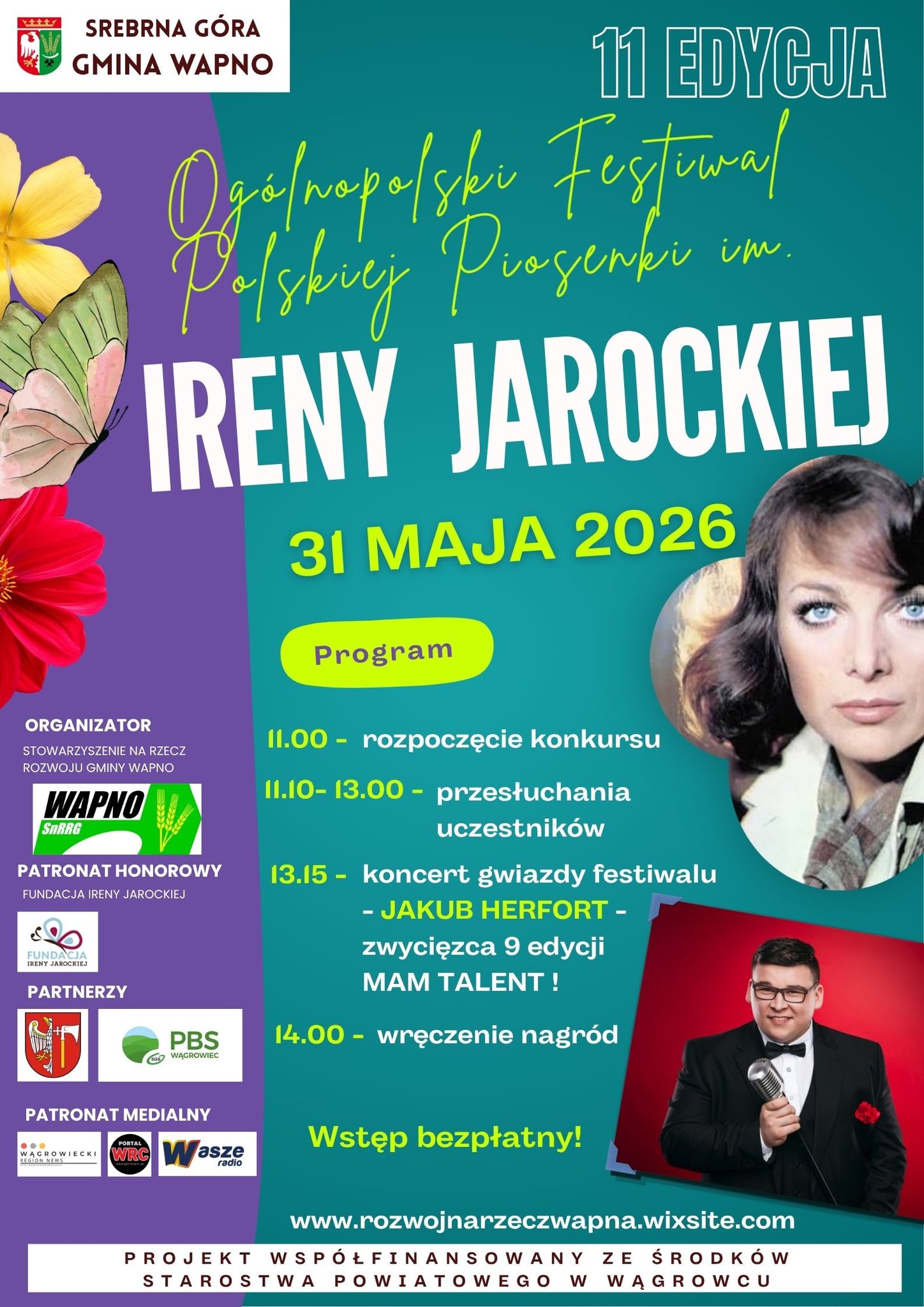 Stowarzyszenie na Rzecz Rozwoju Gminy Wapna zaprasza na 11. Ogólnopolski Festiwal Polskiej Piosenki im. Ireny Jarockiej, który w niedzielę, 31 maja odbędzie się w Srebrnej Górze! Początek o godz. 11.00.