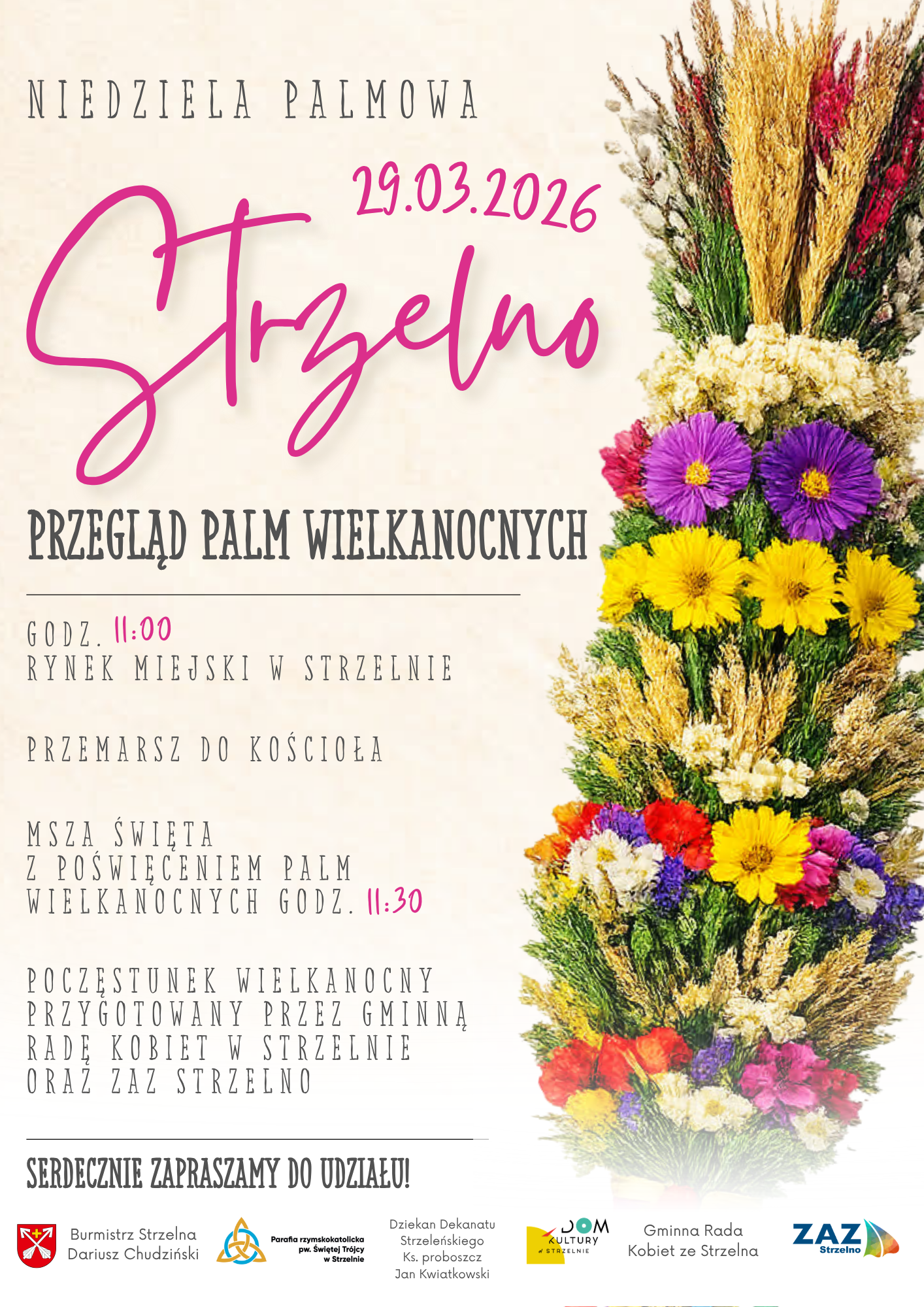 Uroczystości rozpoczną się o godzinie 11.00 na rynku miejskim w Strzelnie, skąd uczestnicy wyruszą w przemarszu do kościoła. O godzinie 11.30 odbędzie się msza święta z poświęceniem palm wielkanocnych.