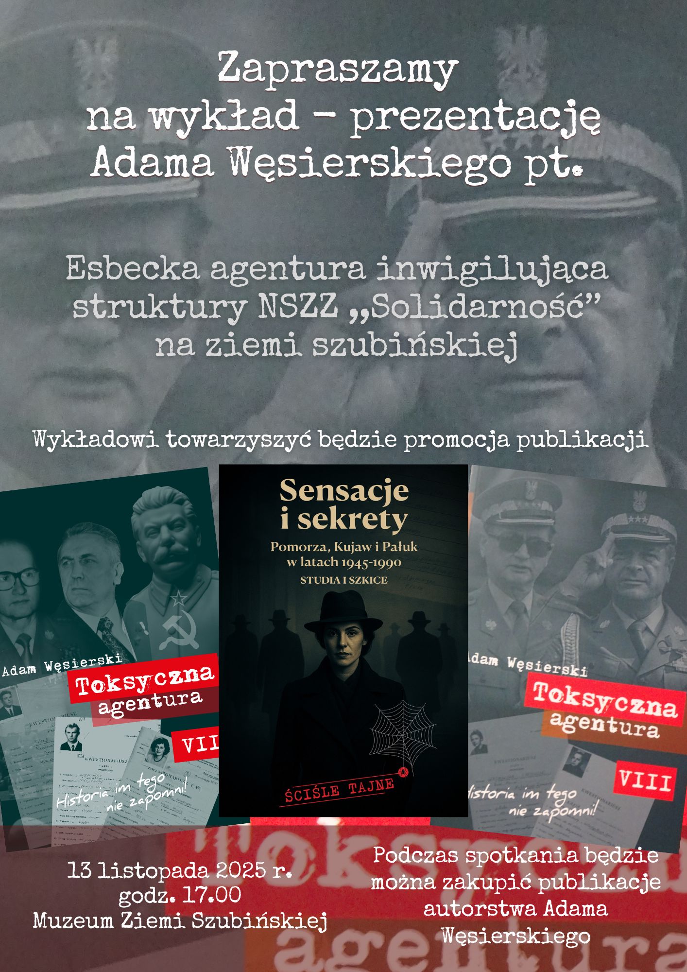 Muzeum Ziemi Szubińskiej zaprasza na wykład - prezentację Adama Węsierskiego pt. „Esbecka agentura inwigilująca struktury NSZZ "Solidarność" na ziemi szubińskiej”.